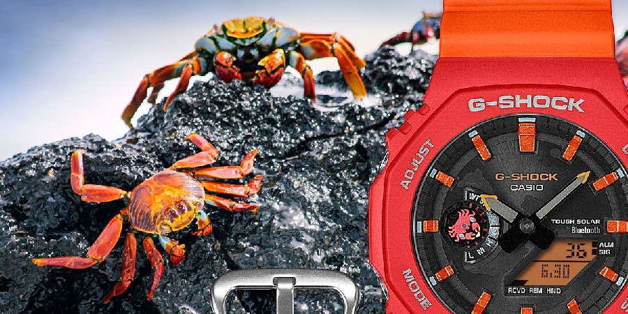 The fiery red GA-B2100DF-4A captures the energy of the Sally Lightfoot crab, a favorite subject for visitors and photographers. Agile and quick, these crabs dart into coastal crevices at the first sign of danger. On the watch, the mode hand takes the form of a crab, with its silhouette also appearing on the strap keeper.