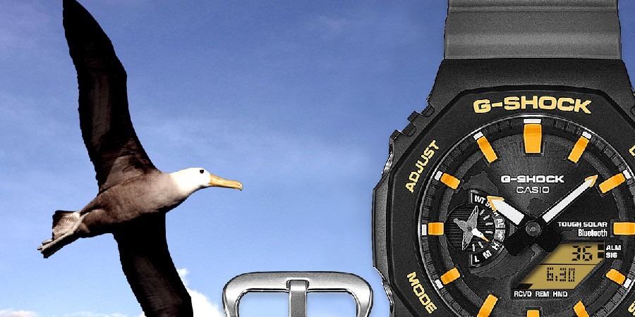 The GA-B2100DF-1A comes in shades of black and gray, reflecting the albatross native to Española Island — the only tropical species of its kind. The bright orange hour markers and hands echo the bird’s beak, while the ash-gray strap mirrors its plumage. The mode hand resembles a soaring albatross, and its silhouette is printed on the strap keeper.