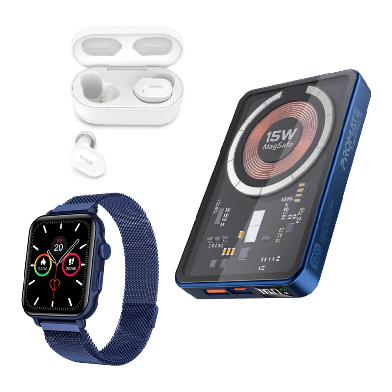سایر محصولات هندزفری بلوتوثی بلکین مدل AUC005btWH SoundForm Play - سفید | پاوربانک بی سیم پرومیت مدل TRANSPACK-5.BLUE با باتری داخلی 5000 میلی آمپر ساعت | ساعت هوشمند پرومیت مدل PROWATCH-B18.BLUE