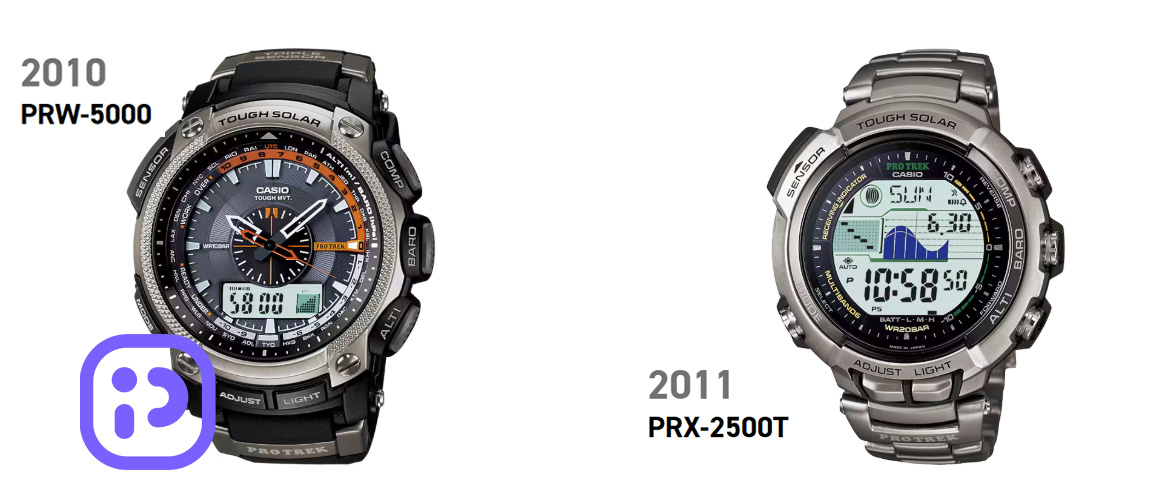 PRW-5000 با نمایشگر آنالوگش بهت اجازه میداد زمان سپریشده و باقیمانده رو سریع ببینی. بعدش، PRX-7000T معرفی شد؛ یه ساعت کاملاً آنالوگ که علاوه بر زمان، دادههای سنسور مثل قطبنما رو هم نشون میداد.